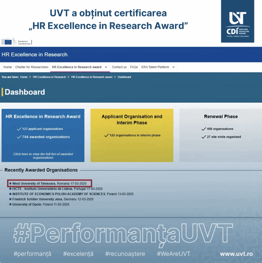 Universitatea de Vest din Timișoara a obținut în 17.03.2025, certificarea „HR Excellence in Research Award” (https://euraxess.ec.europa.eu/hrexcellenceaward/awarded) din partea Comisiei Europene.